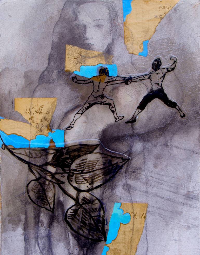 Tableau issu d'une série nommée "superposition". Rencontre poétique de trois sujets sans rapport ,un nu deux escrimeurs et quelques feuilles sur une branche. Intégration de collage , le tout nappé de résine.