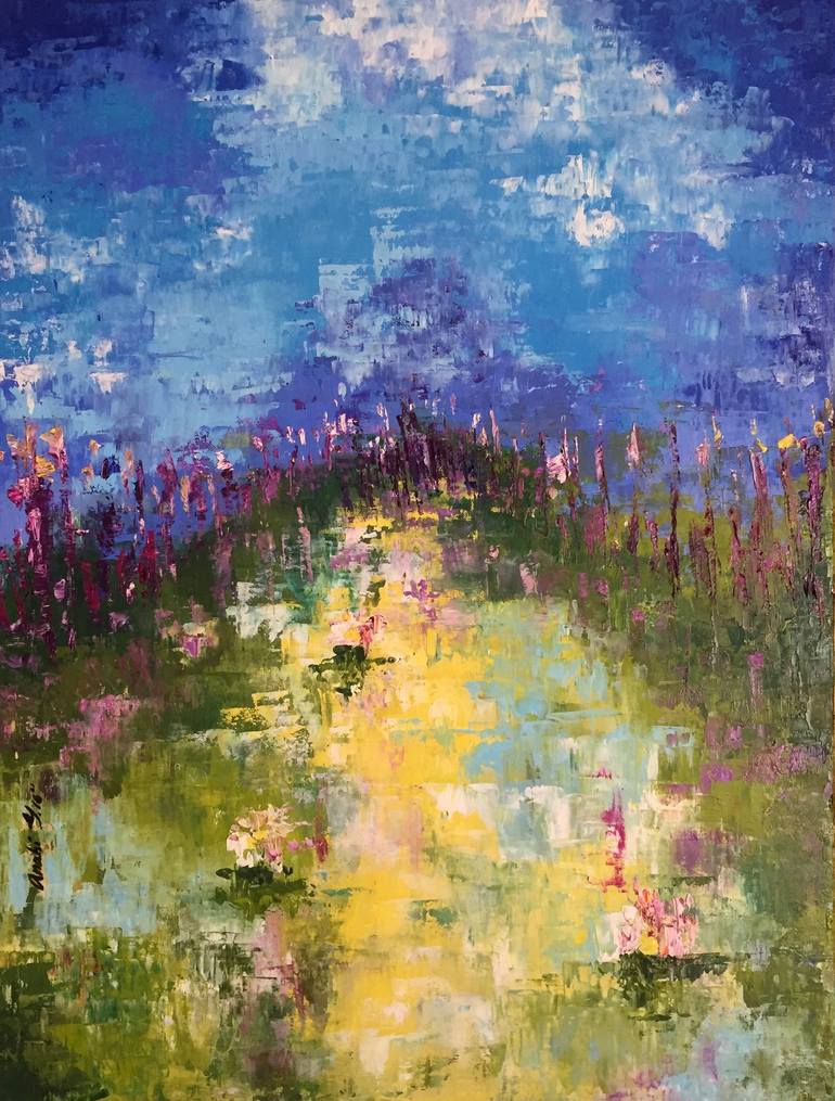 This work I did after a summer trip to the city of Prague, where I rejoiced with its wonderful ponds and flowery gardens. I love being able to have contact with nature and flow in my paintings through it.