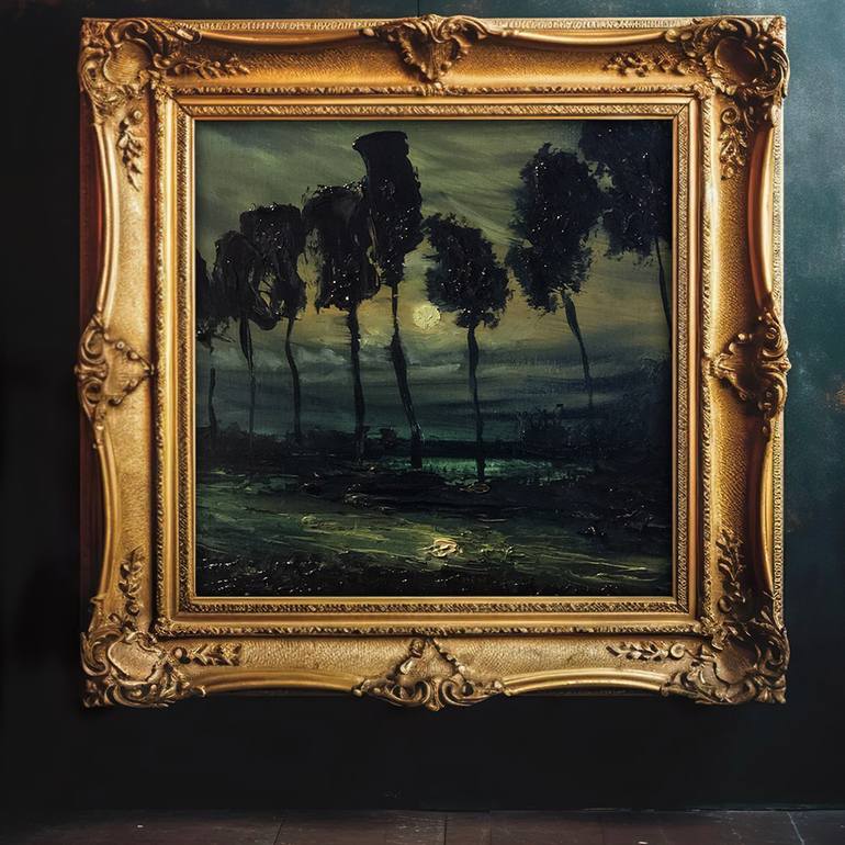 The artist's skilled brushwork brings the scene to life, capturing the delicate interplay of light and shadow among the trees and coastline. The rich colors and intricate details evoke a sense of mystery and beauty, inviting you to explore the hidden depths of this ethereal setting. This artwork is...