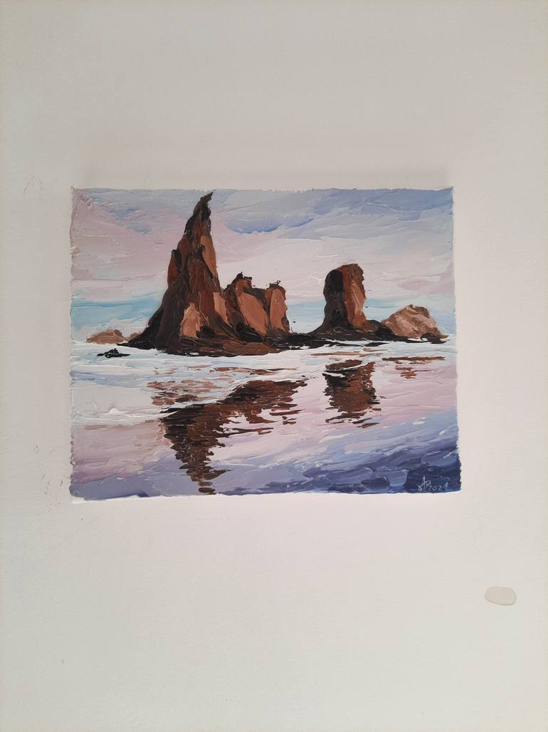 The painting "Euphoria" is about a pink sunset on Benijo beach. Benijo is the most beautiful wild beach on the island of Tenerife. The coast is surrounded by bizarre rocky peaks, which locals aptly called “crocodile teeth”, they are depicted on the canvas. I thi...