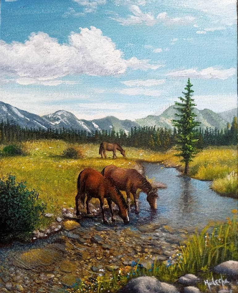 Nature is therapeutic for human soul & painting nature is as therapeutic as visiting a scenic place oneself. Animals, lakes, mountains, flowers, greenery, everything in nature releases ourself from our negative energies & frees our burdened soul. This painting is imaginative & hence depi...