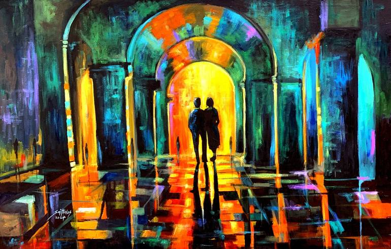 A vibrant, colorful scene depicts two silhouetted figures walking through an arched corridor bathed in warm, glowing light. Bright reflections create a mosaic of hues on the floor, enhancing the sense of depth and atmosphere.