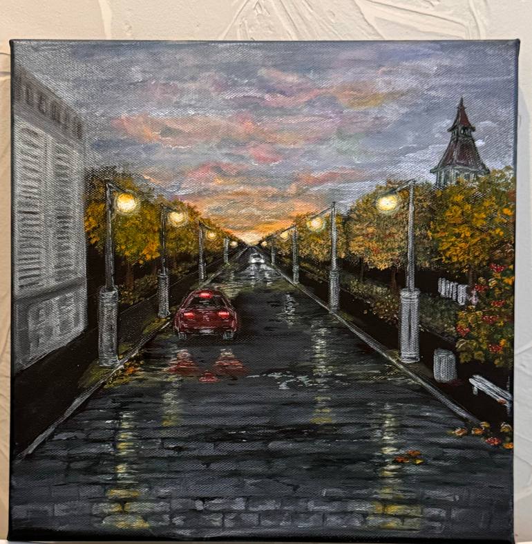I painted this work as a memory of walking home on warm autumn evenings. After the rain, the city becomes quieter, the reflections of streetlights shimmer on the wet road, and the air feels full of calm. For me, “Evening Road Home” is about that tender moment of returning, when the city glows with l...