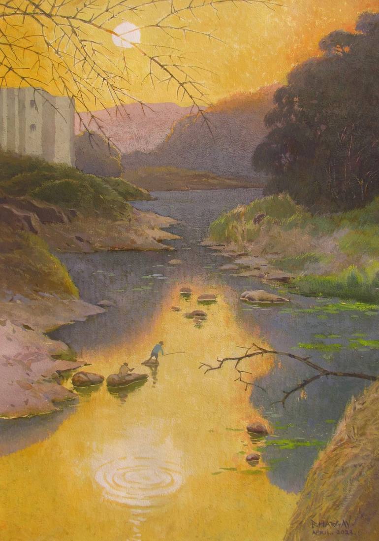 This painting done on location. On one dusky summer evening when sun was setting on horizon, created golden reflections in a water. Few local children were trying their luck in fishing, and trees bushes, mountains were still and clam. The mood was so peaceful. Done in gouache colour on paper. Shippe...