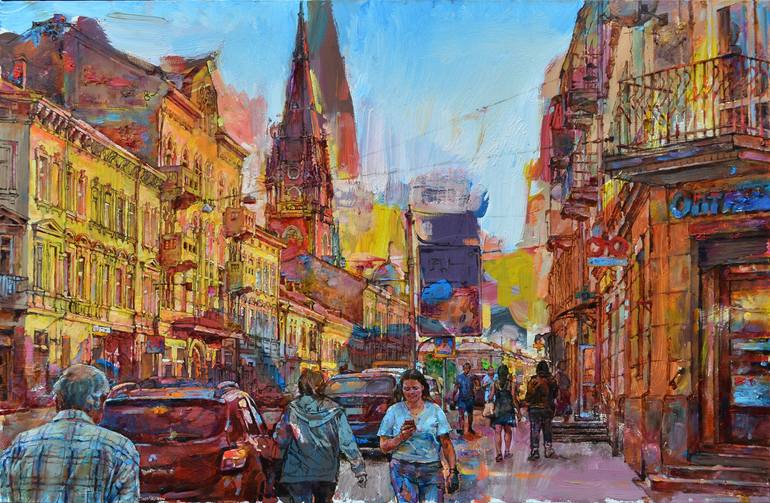 The picture shows the center of the city of Lviv (Ukraine). The painting is made in the style of impressionism. Professional oil paints, texture, and acrylic imprimatur are used here. The painting has a gallery-stretched canvas on a wooden frame and can therefore be exhibited without a frame