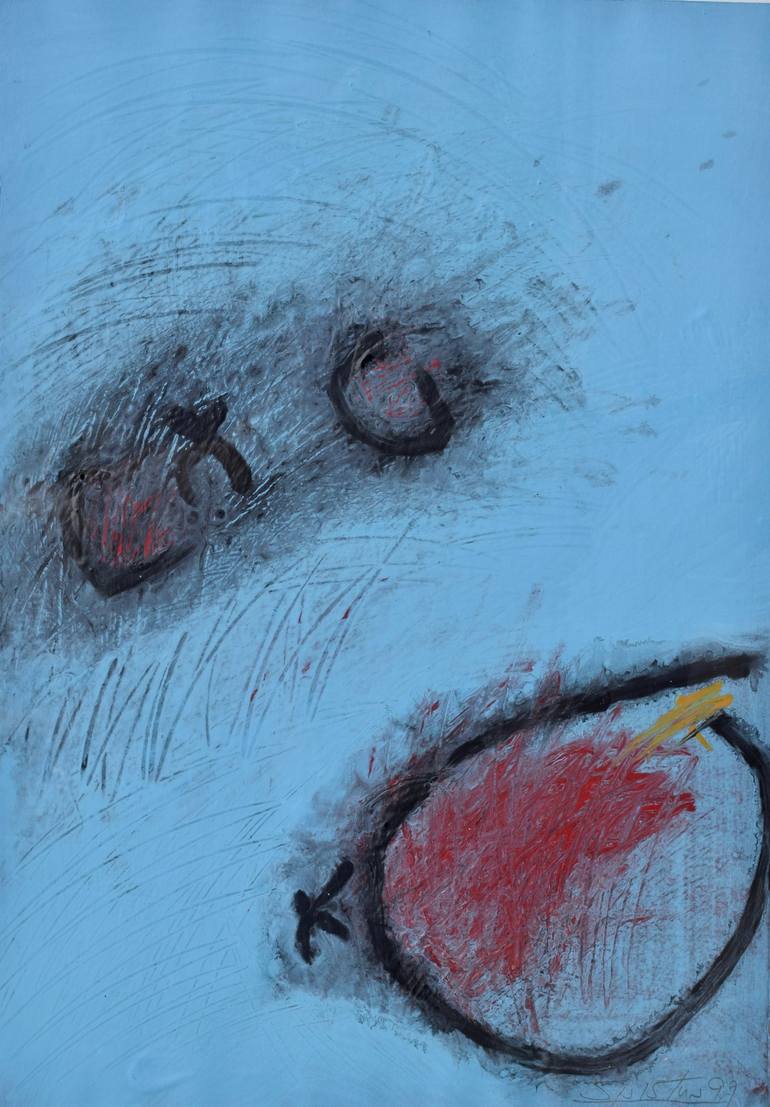 This work is ongoing in the Event Series. It lacks a sense of gravity like astronauts in space. There is no horizontal or vertical reference. It bypasses subject recognition travelling directing to our memory. With few means of red, black and blue much can be communicated. As we make marks an ident...