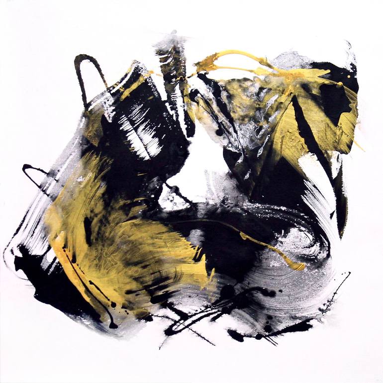 This artwork features a dynamic interplay of black, white, and gold, skillfully merging bold brushstrokes and expressive splashes. The composition exudes movement and energy, with black dominating the canvas to create dramatic contrasts against the white background. Fluid, sweeping lines intermingle...