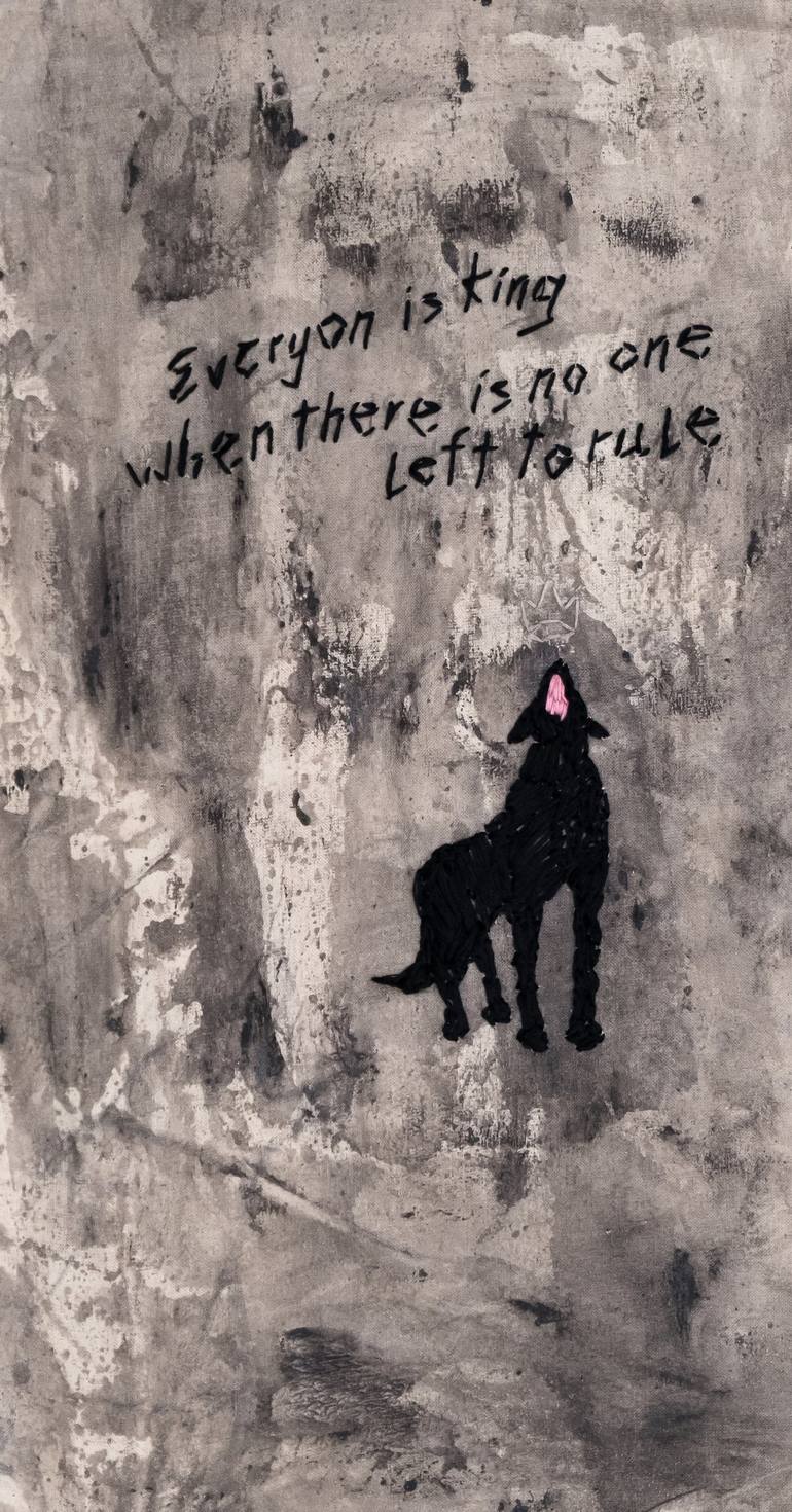 Artwork depicts siluet of howling wolf wth phantom crown and title "Everyone is king when there is no one left to rule". This is the artist's attempt to reflect on human relationships in which personal boundaries often cross and people cause harm under the guise of love. Weaving (embroidery) on canv...