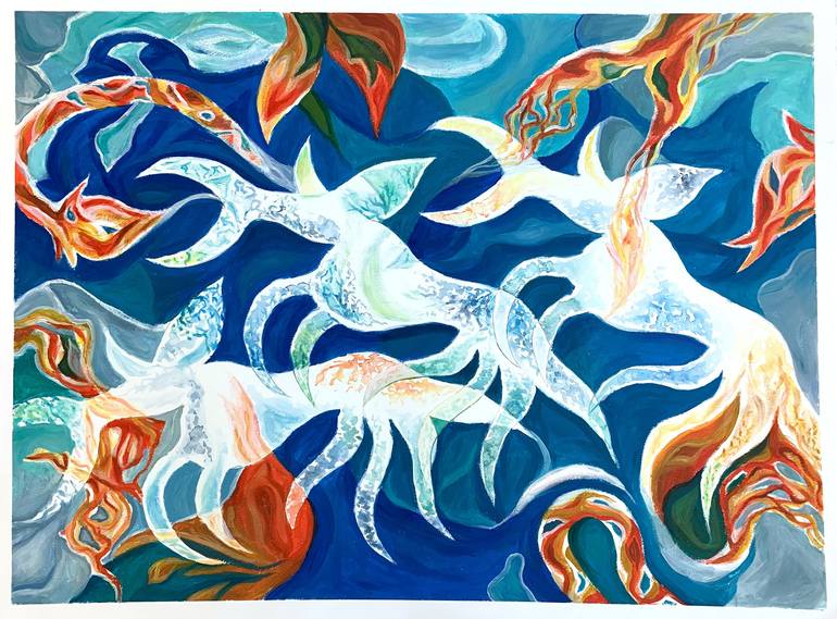 This is a playful abstraction reminiscent of aquatic life, with a soothing yet vibrant color palette.