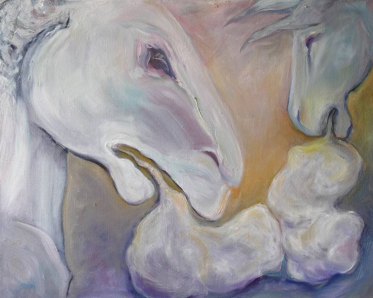 Animals are breathing out and exchanging information. They are struggling to figure things out, so they exchange information of some type. Something internal is becoming external. The paint is somewhat textural, and overall, painterly. The viewer might relate to this painting as about animals and w...