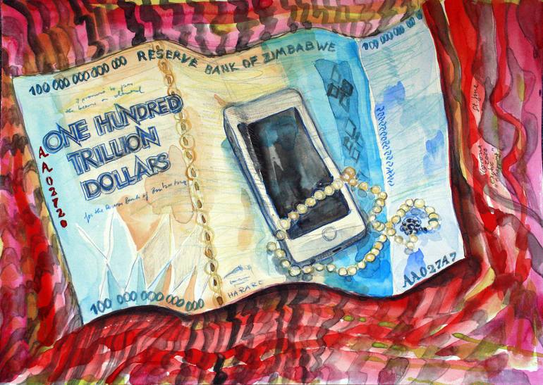 This painting is part of the „Corona Currency” series that shows imaginative banknotes and was inspired by the Corona period 2020. During the “shutdown” of shops, schools and meeting venues, people's longing for social closeness and (consumer) experiences was growing. The paintings of this series s...