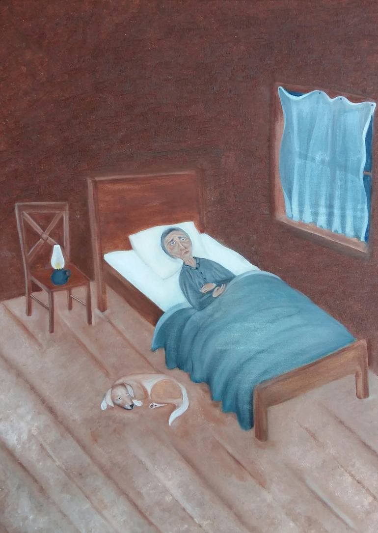 A dying old man and the dog which is the only true friend. Both on the old lady's face and puppy's face captures the hardness of life. She crosses herself for the last time