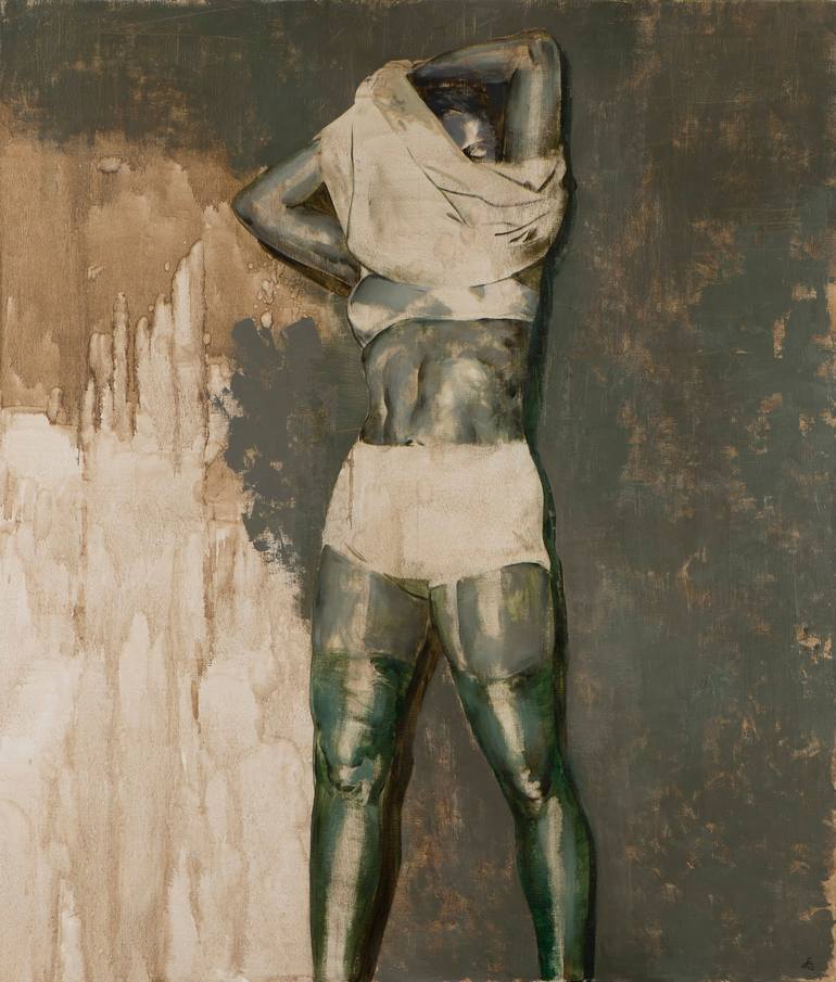Figurative painter. Lives and works in Sanok, Poland. The world in Szczepkowski's paintings is a world apart, something keeps us away from it. It is populated by individuals who, although realistically presented and not exactly imaginary, seem strange. They're believable and unreal at the same time, familiar despite being distanced and "not quite from here." Why do they look like both apparitions and neighbours? It is because they're on the border, one foot on the other side, older by not one but two generations. Their outfits, one piece underwear, modest hairdos, in positions that remind those in a child's ABC book or instruction board. Finally - yellowish groundwork and faded colours. They come from the dark times of brown-coloured uniforms, shiny petticoats, and steel machine guns and radio transmitters. The times that, although not so remote, already seem unreal, made even more terrifying thanks to the grandparents' stories yet appealing thanks to what could be found in the attics and other nooks and corners. Safely hidden in the shade, we get a sneak peak of the complex rituals those apparitions are performing, appearing out of the dark background. We often witness oppression or even violence, that we somehow find ourselves guilty of, without actually being part of it. Looking at the Unspeakable that comes out of the dark background, we become a director manipulating the spotlight, and willing to hide more than to reveal... As if strangling? Maybe rescuing? Dark and suffocating pictures of Szczepkowski derive from the borderline of the existence and non-existence of: the proof - material props and recollection - a failing contamination. They can be both the presence that has passed or an echo of the past. A living shadow, a living dead.