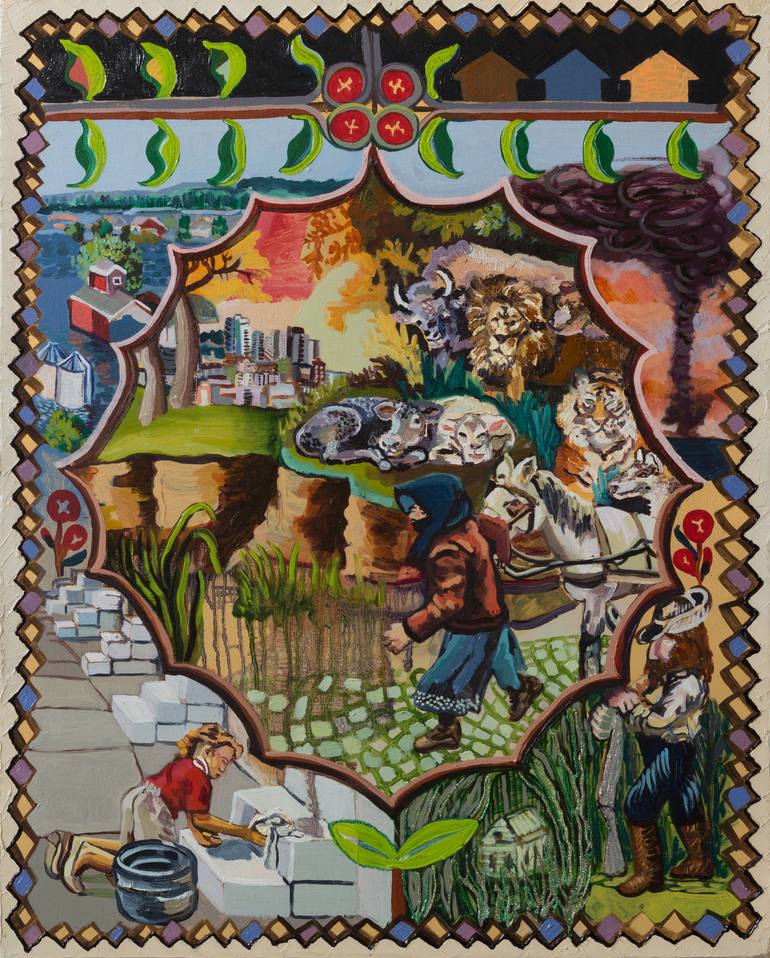 Referencing the painting "Peaceable Kingdom" by Edwards Hicks, one that he repainted multiple times, I replaced the animals from his painting, with animals now extinct. In this version, man has both conquered nature and nature has vengeance on man through, floods and hurricanes. In the center, is ...