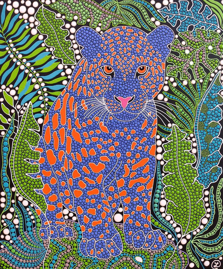 Original acrylic painting on stretched canvas, ready to hang. Title: Eye of the Jungle Size: 50*60 cm / 20*24 in Medium: acrylic Technique: Dot art "Eye of the Jungle" showcases a majestic jaguar in striking blue with vivid orange spots, set against a lush tropical background filled with detail...