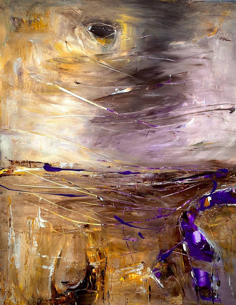 "Eye of the Storm" captures the awe-inspiring power of nature's sudden shifts. The abstract expressionism style evokes a sense of immediacy, mirroring the fleeting nature of the depicted weather patterns. Yellowish grey and brown hues dominate, punctuated by hints of purple, illustrating the sky's d...