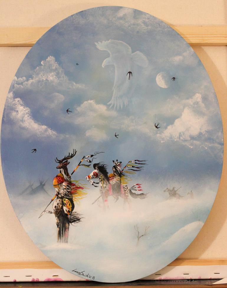 This is done in a classic style... Timeless. Native Americans viewing the plains from a vantage point beckoning the spirit of the eagle. Looking for danger, intruders, buffalo? With the snow blowing across the ground... This is one of a kind piece no prints are made of this. Painted on an oval canva...