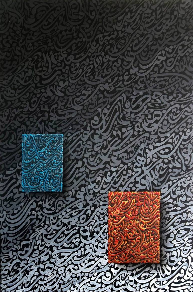 FAR AWAY By Sami Gharbi (Tunisia) 80x120cm .الخطوط : مجوهر جليل . خط حر Acrylic and pastel on canvas Abstract Arabic calligraphy Random letters without literary meanings