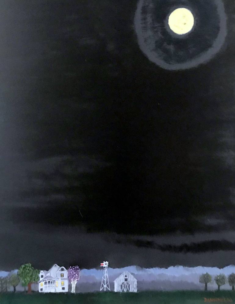 RURAL FARM HOUSE, WINDPUMP, BARN, AND TREES ILLUMINATED BY MOONLIGHT.