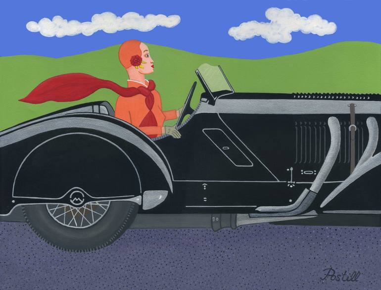 Inspired by the Film "The Fast Lady". Hope the viewer finds the image appealing. Acrylic paint suits my Naive style of painting.