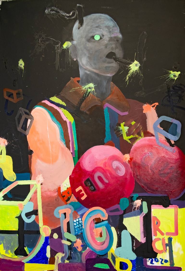 These work was painted as a part of the "PEOPLE FROM PAINT " serie. Strong colors and contrast with the graffiti elements are the main subiect in this work.