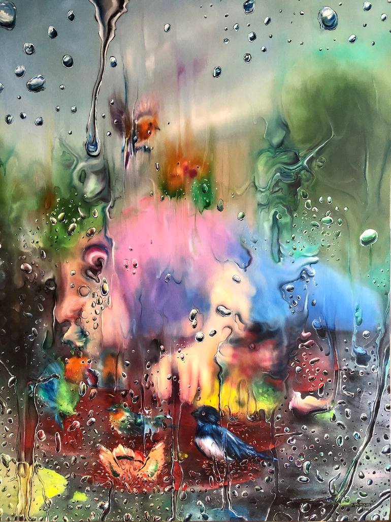 Filters" is a surreal work that transports viewers to a dreamlike realm where reality merges with imagination. Through the perspective of a rain-fogged glass, the scene reveals a group of lush, vibrant and exotic birds that They enjoy a heavenly bath in the rain. The rain, represented by ethereal s...
