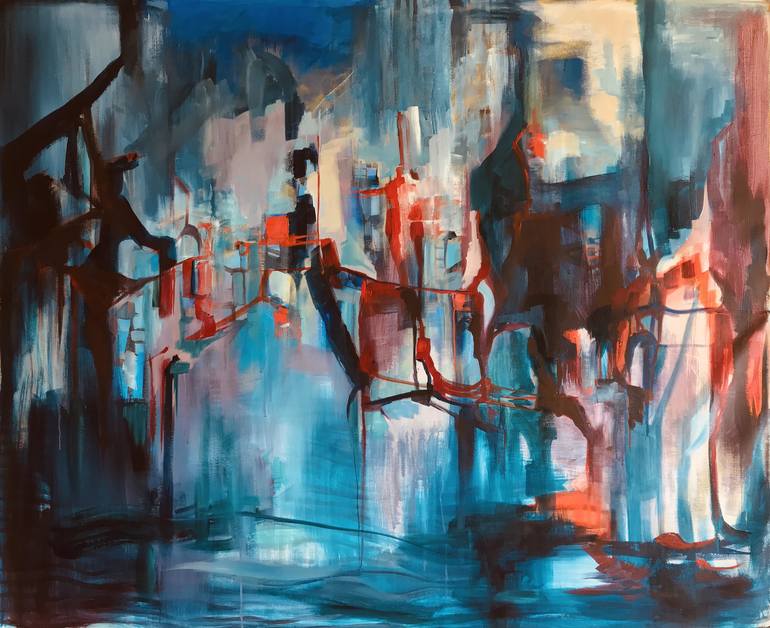 "Floating city" is a painting simultaneously grounded and fluid, with a cinematic, almost futuristic ambiance. It evokes the essence of a dreamlike urban or industrial landscape. The composition is layered with dynamic brushstrokes and a cool, moody color palette dominated by deep teals, rich navy...