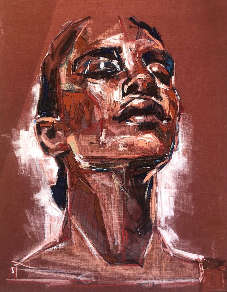 "FUJI" is a powerful oil and palette knife portrait on linen, embodying unwavering integrity and emergence. Its robust textures and upward gaze convey serene inner strength. A visual metaphor for resilience, inviting contemplation of our own authentic power.