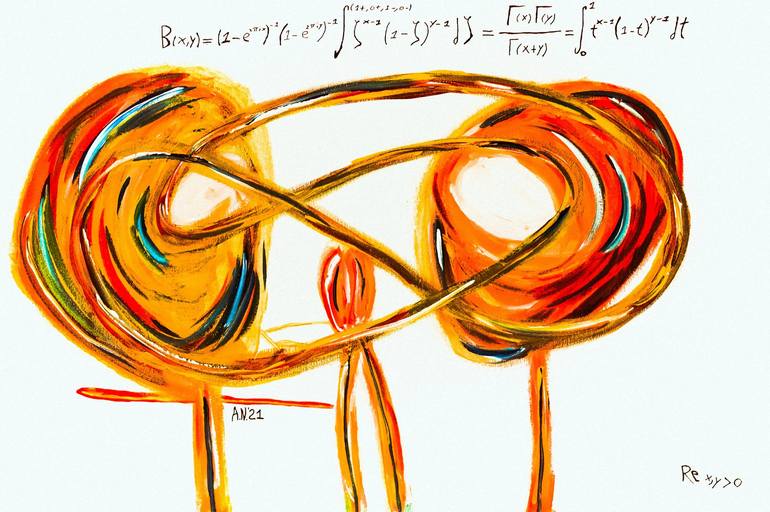 Face to face, they promised to love each other. The 'connection' between the two figures retraces the curve used to prove the Beta function. This special function, shown of the top of the painting, is also known as the Euler integral of the first kind. The Beta function is closely related to the Gam...