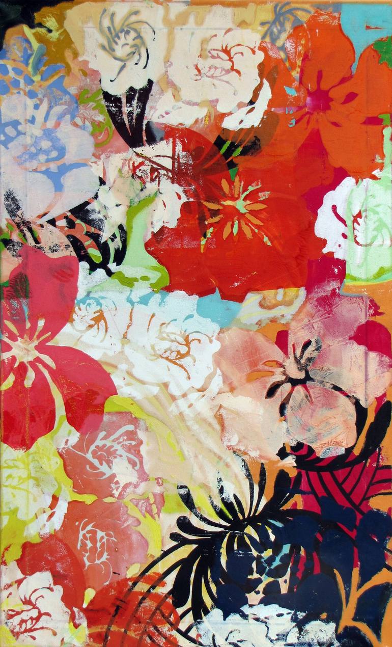 Exuberant and vibrant multi-layered mix of color, paint, and silkscreen intermingling in a visual bouquet. Put your face near, and smell the flowers!