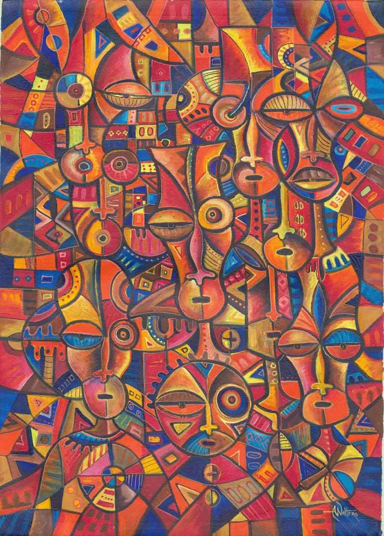 From remote Central Africa, Cameroon artist Angu Walters already had a real hard time trying to emerge from obscurity and now there’s a civil war going on centered in his own city of Bamenda. Happily, he has American friends who look out for him. Originals and top quality giclee prints are available to be delivered from the USA. Angu Walters was born in 1980, native of Nsongwa in the Mezam Division of the North West Province of Cameroon. Apart from being a fine artist he also sings with the “Melting Age Band, MAB” in the company of the late Spee. He likes traditional African music. His interest in painting started when he was a boy experimenting with ink from different pen colors, mixed and applied them on torn cardboards, which were sometimes hung on the walls of his mother’s sitting room. His mother invited Spee, a very famous artist to show him what the child was doing with the materials he could find in his milieu, thereafter the artist took him to his workshop, under his guidance so to better improve on his skills. Since then, he has had a professional revolution with much inspiration drawn from his fine arts mentor. His works express surrealism because he believes that his dreams are inspirational to his life and works. He titles his favorite painting “The Happy Family” because to him, the family is the foundation on which a successful professional and matrimonial life is built. He has trained five fine artists whom he says are excelling in the profession. Although artist are not very appreciated in Cameroonian society. One of his dreams is to set up an art center/school in Bamenda in support of Cameroonian painters trying to make a career out of tiger art.