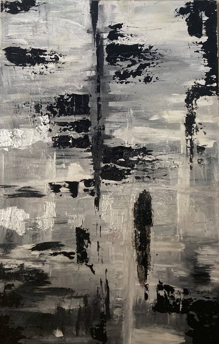 This is a large abstract acrylic painting (36 x 30 in) on stretched canvas. This piece is in tones of black and white made with highly pigmented fine acrylic paints, modeling paste, and high gloss medium, giving this piece a variety of finishes, as well as texture, making this painting feel alive an...