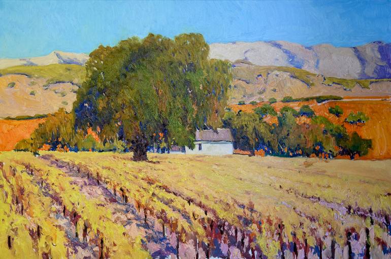 Soft yellow colors of vineyards in the fall, beautiful, full of sunlight mountains and big trees together create a dynamic and harmonic composition reflecting the beauty of Californian vineyards. I created this composition inspired by vineyards around Santa Barbara county. The artwork is on oil-prim...