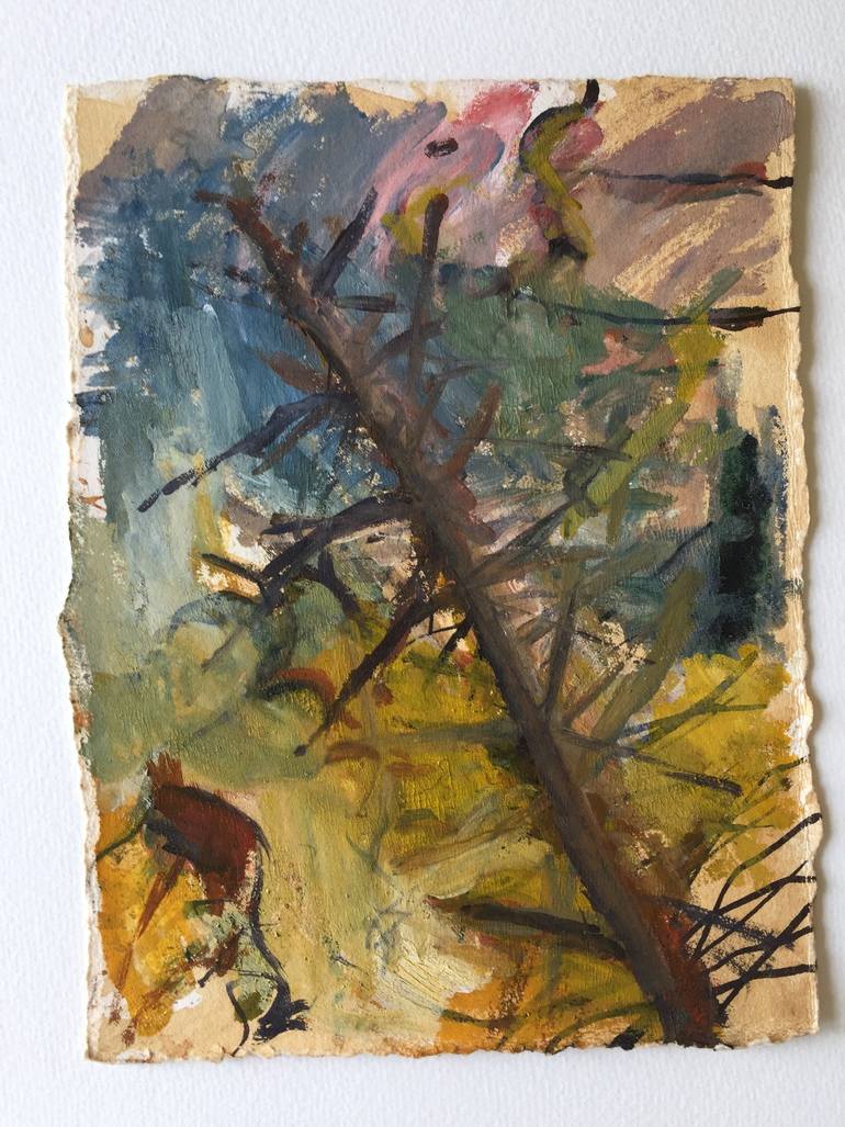Mixed media on paper. This sketch of a fallen tree was completed in the studio. Subject matter taken from imagination after a walk through the forest.