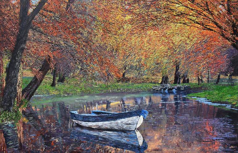 This painting conjures the emotion of nature’s love for man. The boat represents the human element and with the play on words, nature is falling for love and harmony with man. The feeling is embracement. The painting is executed in Clear Impressionism style in thick oils with bright colors, fluid mo...