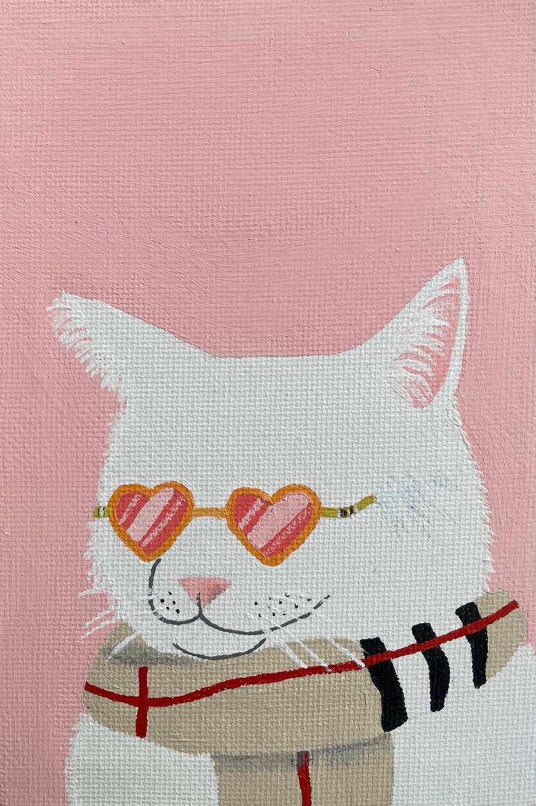 A white cat wearing pink heart glasses and a burberry scarf. Light pink background.
