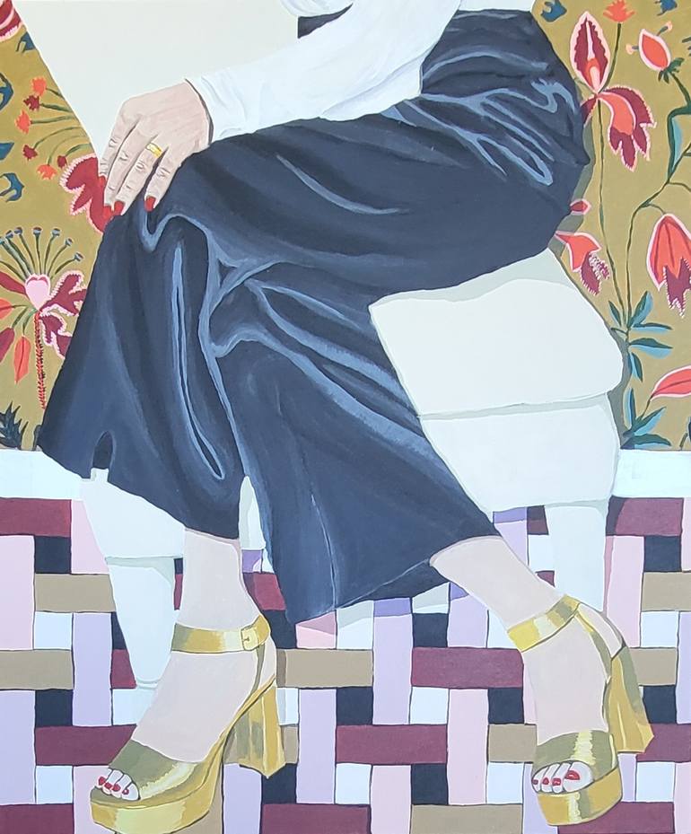 Here we have an elegant lady dressed in stylish pants and shoes. She may have just returned from a night out, or perhaps a quick grocery run for a chocolate bar and bottle of cabernet. She has a passion for the color gold, platform heels, and red nail polish.