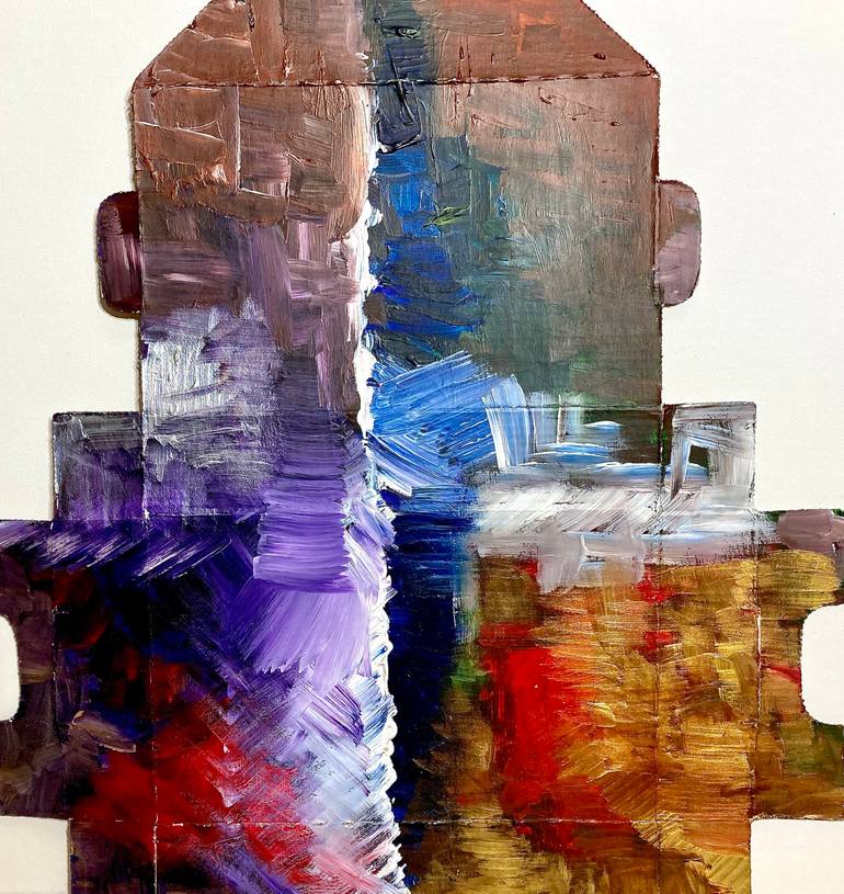 As parcel post trash mounts perfectly functional boxes, I decided to use these boxes as a canvas for abstract art. This is part of a series called "Fantasy boxes". One can frame them as is, or fold them into a box to be used as a gift etc.