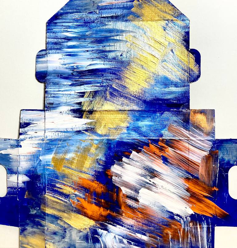 As parcel post trash mounts perfectly functional boxes, I decided to use these boxes as a canvas for abstract art. This is part of a series called "Fantasy boxes". One can frame them as is, or fold them into a box to be used as a gift etc.