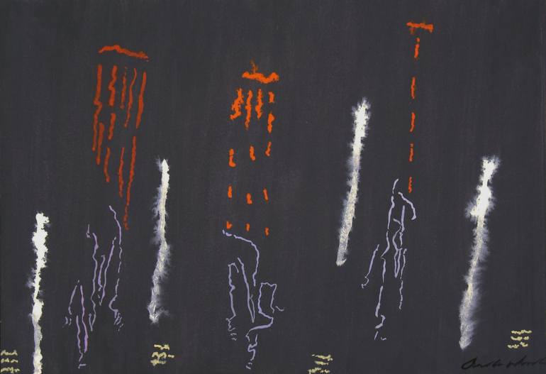Watercolor and gouache on 140 lb. 100% rag watercolor paper. Abstract art that contains some humor with a visual vocabulary of beasties that swoop, dance, bounce and emote across a large stage.