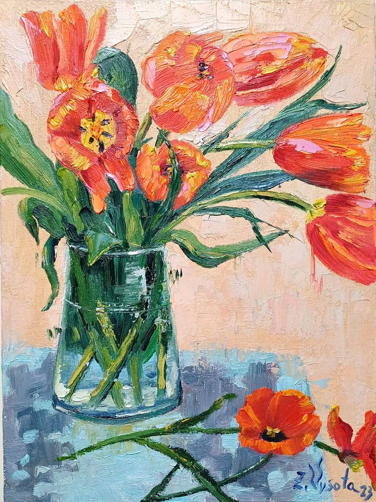 --- Favorite Flowers - Red Tulips. The oil painting depicts a bouquet of red tulips in a vase on a table. The bright petals of the flowers contrast with the light background, creating a feeling of warmth and richness. The highlights on the petals and leaves give the painting v...