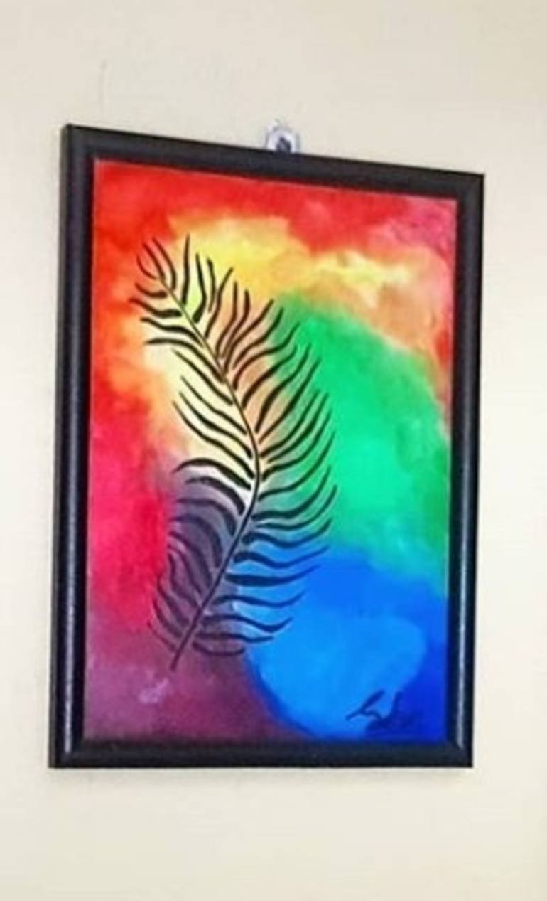 This painting is a skeleton of a feather which is in a multicolored abstract background.