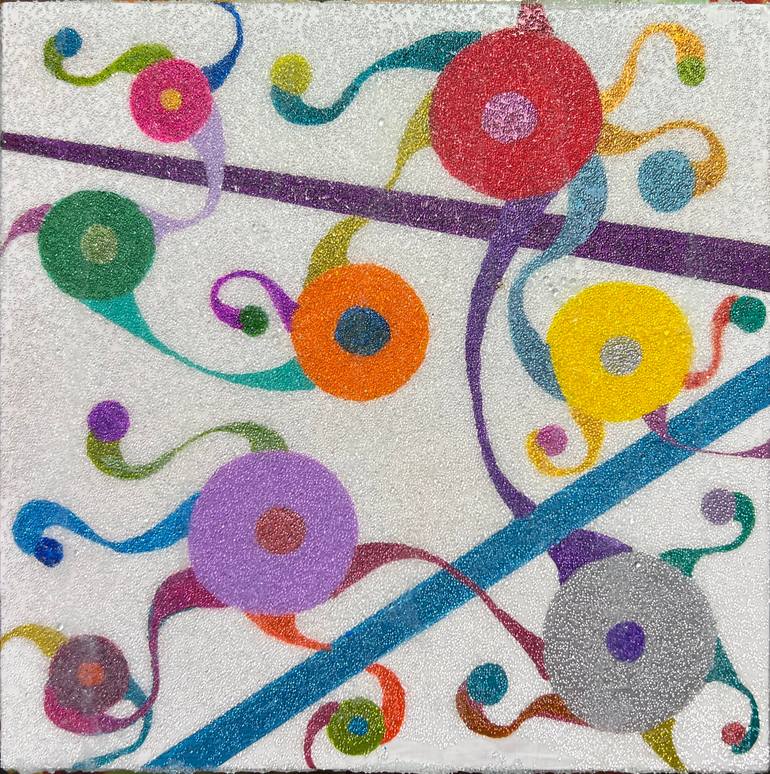This is a smaller piece in my lyrical abstract series. It is acrylic on wood panel painted on 5 sides and then covered in glass bead medium on five sides as well. These pieces are musical and about interconnection interdependence and joy!