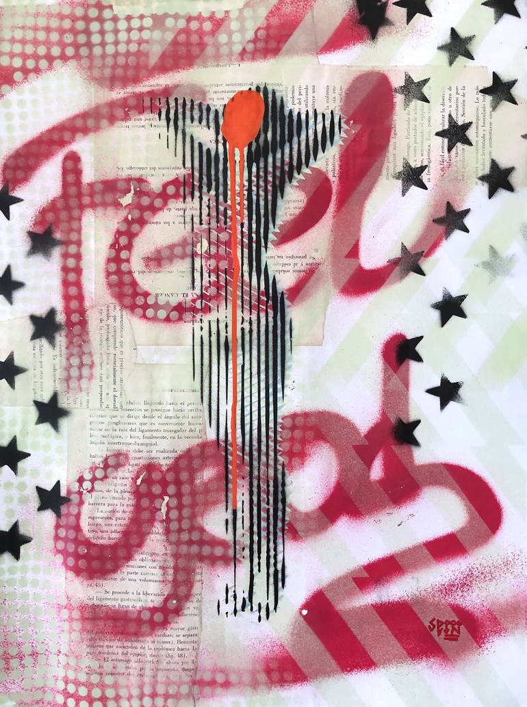 Graffiti markers, spray and stencil on recycled paper collage, 52,0x38,7cm, 2018. This artwork was inspired on John Baldessari's art. By defacing people with a color dripping I want the viewer to concentrate more on the movement, posture and embedded meanings of the scene itself rather than people...