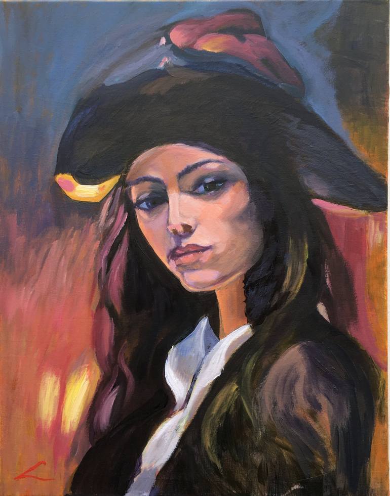 A painting depicts a woman wearing a large black hat, with her face partially cast in shadow, exuding a mysterious aura. Long hair flows down her back, suggesting a sense of movement and elegance. The background of the artwork features three distinct color blocks of bright orange, light pink, and li...