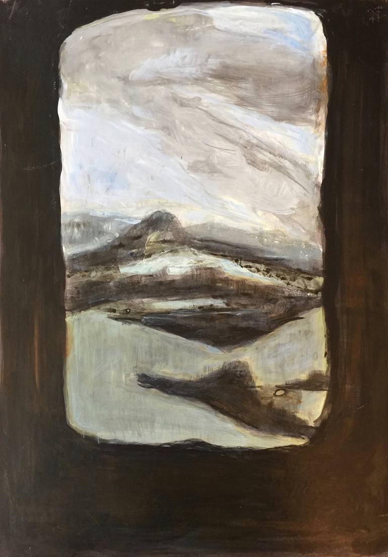Ce tableau est inspiré d'un paysage du chili observé en avion au travers d'un hublot. J'ai redessiné en rentrant à l'atelier cette vision, cette porte ouverte sur le monde. J'ai travaillé avec de l'encre, de la peinture acrylique et du cirage à chaussure. J'ai marouflé de dessin sur une planche en b...
