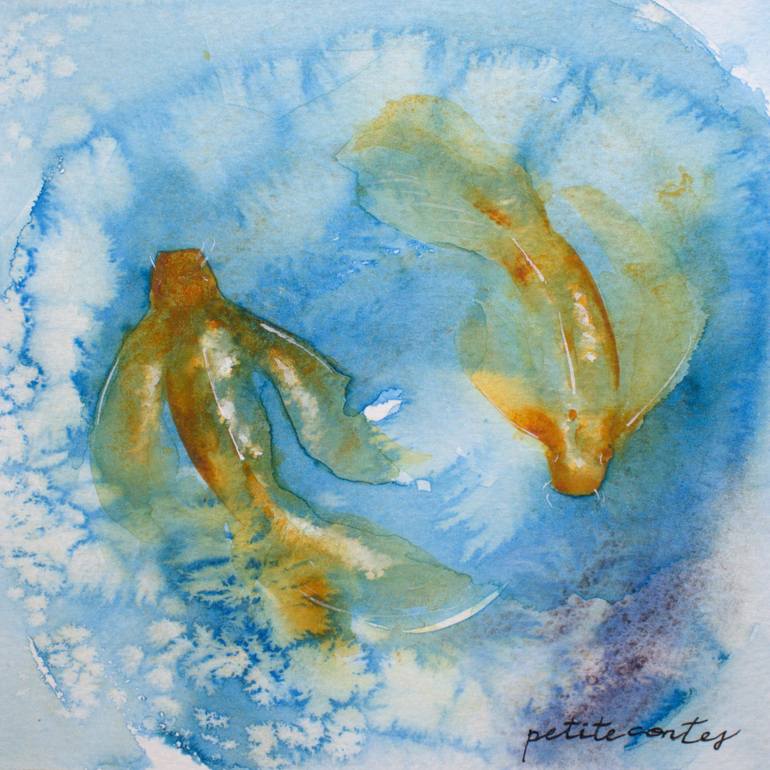 Two vibrant orange with white koi fish swim gracefully in a harmonious yin-yang pattern, surrounded by sparkling turquoise waters. This Feng Shui-inspired piece symbolizes peace and balance, perfect for creating a calming atmosphere. Painted in an abstract realism style using Daniel Smith Primatek p...