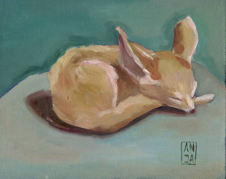 This 25x20 cm oil on canvas painting captures an adorable fennec fox in a serene sleeping pose. Created in an impressionist style, the artwork features simple brushstrokes and a soft pastel color palette against a minimalist background. The gentle hues and delicate details convey a sense of peace an...