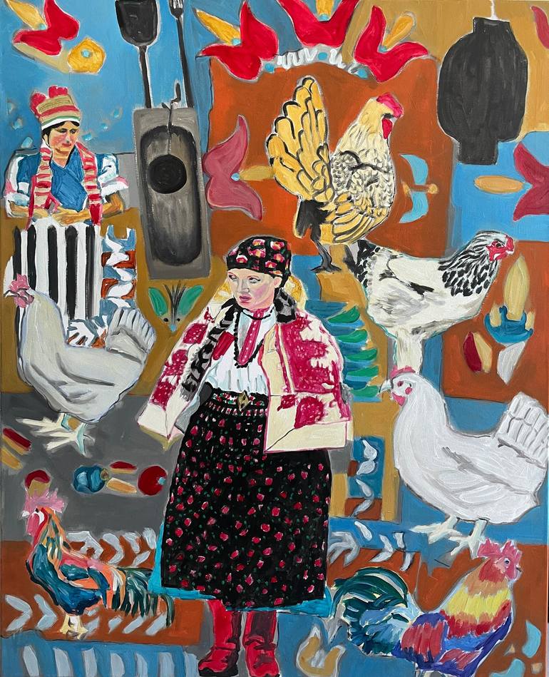 Statement My work explores the deep connection between humans and nature, rooted in my long-standing interest in folk traditions and their environmental wisdom. I am inspired by how traditional cultures understood nature as a sacred force connected to God, the universe, and spiritual well-being. Folk heritage carries a deep respect for life and all living beings, while offering protection, identity, and a sense of belonging within the community. My interest in folk tradition goes beyond visual elements: it represents a way of thinking that emphasizes harmony with nature, responsibility, and continuity between generations. Through expressive human figures, my paintings unfold in an illustrative and powerful style, reflecting the relationship between people, their environment, and cultural memory. Folk costumes appear as symbolic elements in my work, alongside visual influences from the 1970s and 1980s, which strongly shape my artistic language. My name is Eszter Szabó. I was born in 1979 and completed my studies as a decorative painter at the B.D. Art School in 1997. After graduating, I worked in my profession for several years, including the restoration of frescoes and historic walls in some of the largest archives in Hungary, collaborating with a highly respected restoration company.