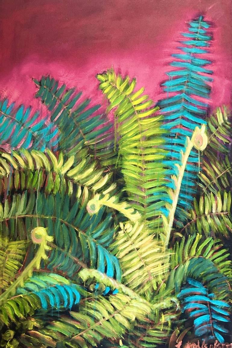 Immerse yourself in this wild fern field. This warm fern artwork is painted with contemporary markmaking and some added paint drips, to simulate the feel of movement. The hot pink magenta sky adds a dynamic, vibrant glow, and modern color accent pops.
